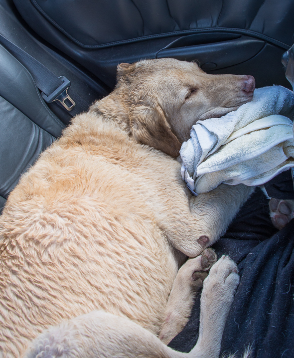Linus rides in the rear and I got the whole back seat to myself. Not quite as much room as the van to stretch out and sleep but I could see much better out the windows and there is lots of new things to see here.